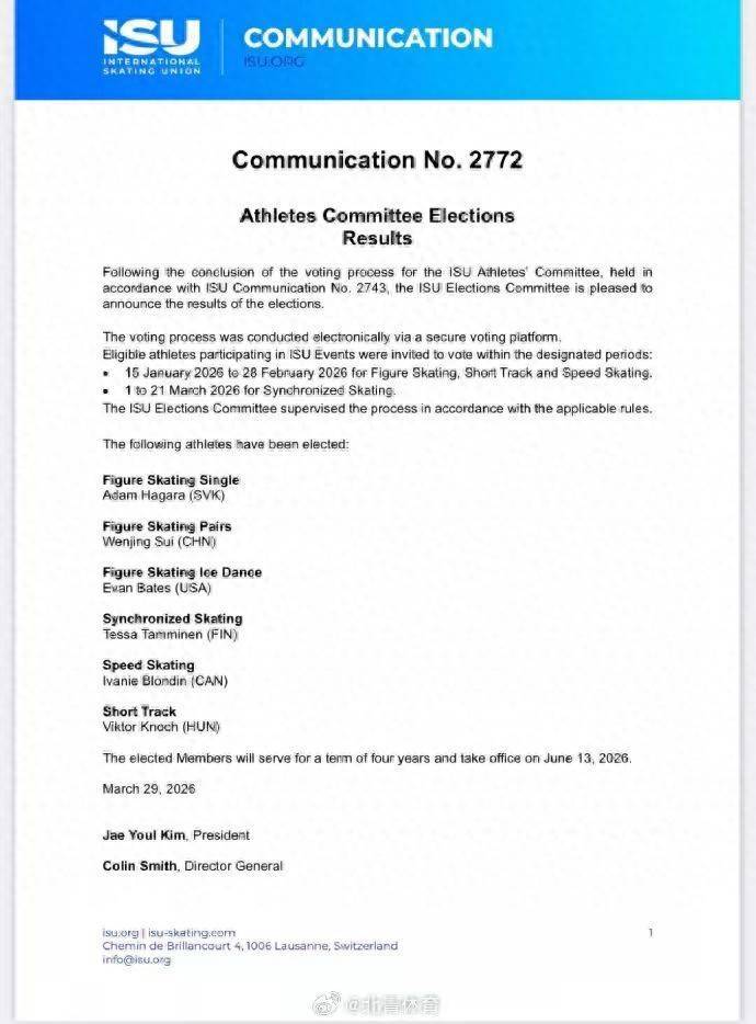 在此前公示的竞选宣言中,隋文静曾表示,如果有幸当选委员,将重点推进三项核心工作。第一,传递真实的运动员声音。将我从训练伤病到职业转型的亲身经历,转化为沟通桥梁,回应运动员在规则公平、伤病保护以及退役转型等方面的迫切需求;第二,推动经验传承。分享我在“大满贯”征程中积累的技术与心理调整经验,并结合科研成果,助力全球年轻运动员成长;第三,促进文化融合。以花样滑冰为纽带,通过体育舞台让更多民族文化元素被看见,同时搭建不同项目运动员之间的交流平台。