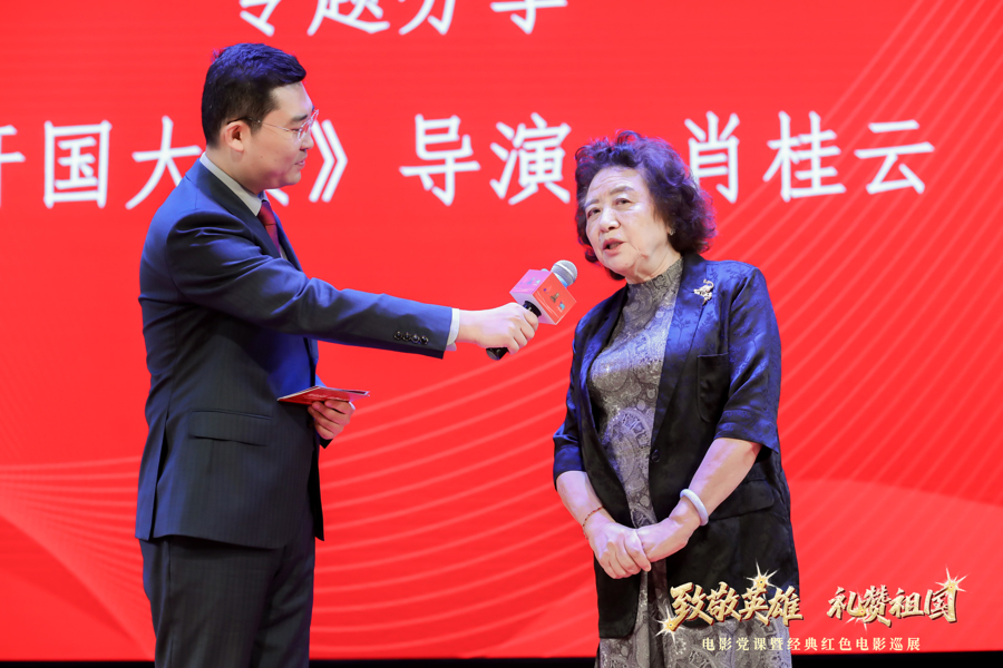 不久前,习近平总书记给8位电影艺术家回信,亲切问候并勉励广大电影工作者要坚定文化自信,扎根生活,创作出更多精品佳作。《开国大典》的导演肖桂云正是收到回信的八位老艺术家之一。肖桂云导演当日惊喜“空降”活动现场,她结合习近平总书记的回信,回顾了《开国大典》的创作历程。当时影片面临巨大困难:预算仅有500万元,要求在一年时间内完成,涉及138位历史人物和15万名演职人员: “领导当时跟我们说过一句话,他说:‘我们老一辈把江山都打下来了,你们为什么拍不出电影来?’我觉得这句话是对我们的鞭策,也是我们的责任,要通过银幕展现出来、让更多人看到新中国成立的过程。”提及总书记回信,她激动地表示,“他是对整个长影,对整个文艺界、电影界的支持和关心,因为他为我们指出了前进的方向,让我们感到特别兴奋、特别的高兴。我们要按照这个方向去约束自己,努力前行。”