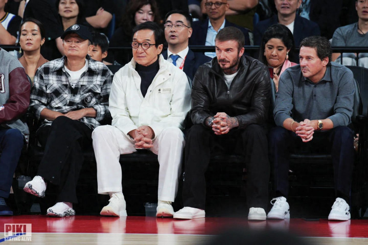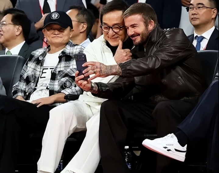 而成龙的右边,是硬汉贝克汉姆,一件黑色皮夹克就是硬帅,因为喜欢成龙,还主动求合影,跟个小迷弟似的。