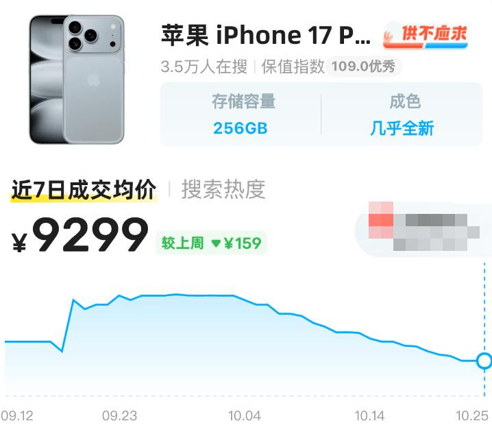 而国内二手市场中,iPhone 17 Pro Max(256GB)二手成交价在 8760—9600 元之间,7 天均价在 9300 元左右,贬值 600 元左右,2TB 二手价均在 16200 元左右,贬值 1799 元。