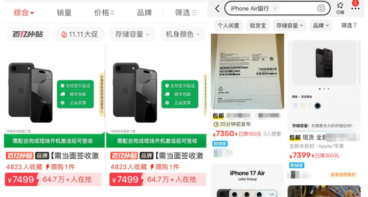 我们也查询了一下第三方平台,发现部分电商平台以及二手平台上的 iPhone Air 价格要比官方便宜一些(非官方售价,仅供参考)。