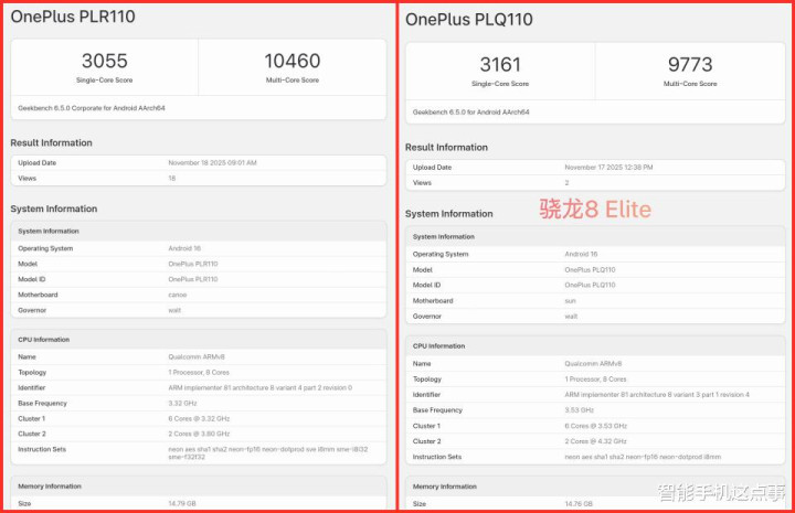 对比骁龙8至尊版的话,它的单核成绩稍微低一点,但多核分数反而更高。