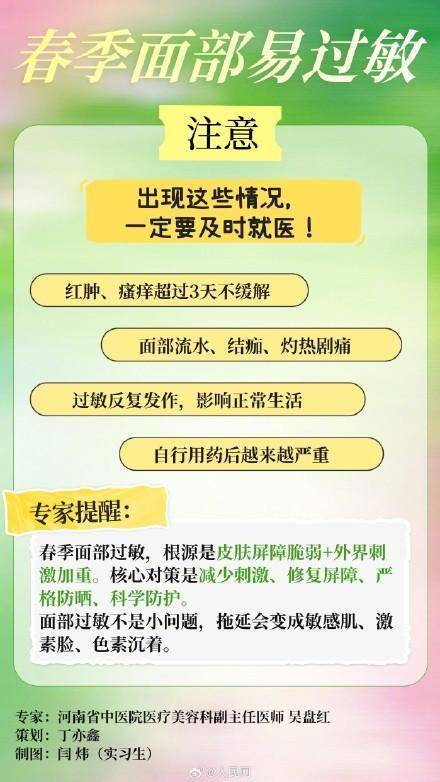 春季是面部皮肤过敏的高发期,有人出现泛红、干痒、刺痛等症状,严重者甚至出现爆疹、红肿。医生表示,春季面部过敏并非皮肤突然变差,而是环境、气候与皮肤状态共同作用的结果。春季面部过敏3步急救原则——停、简、修,教你科学应对春敏。(人民网)